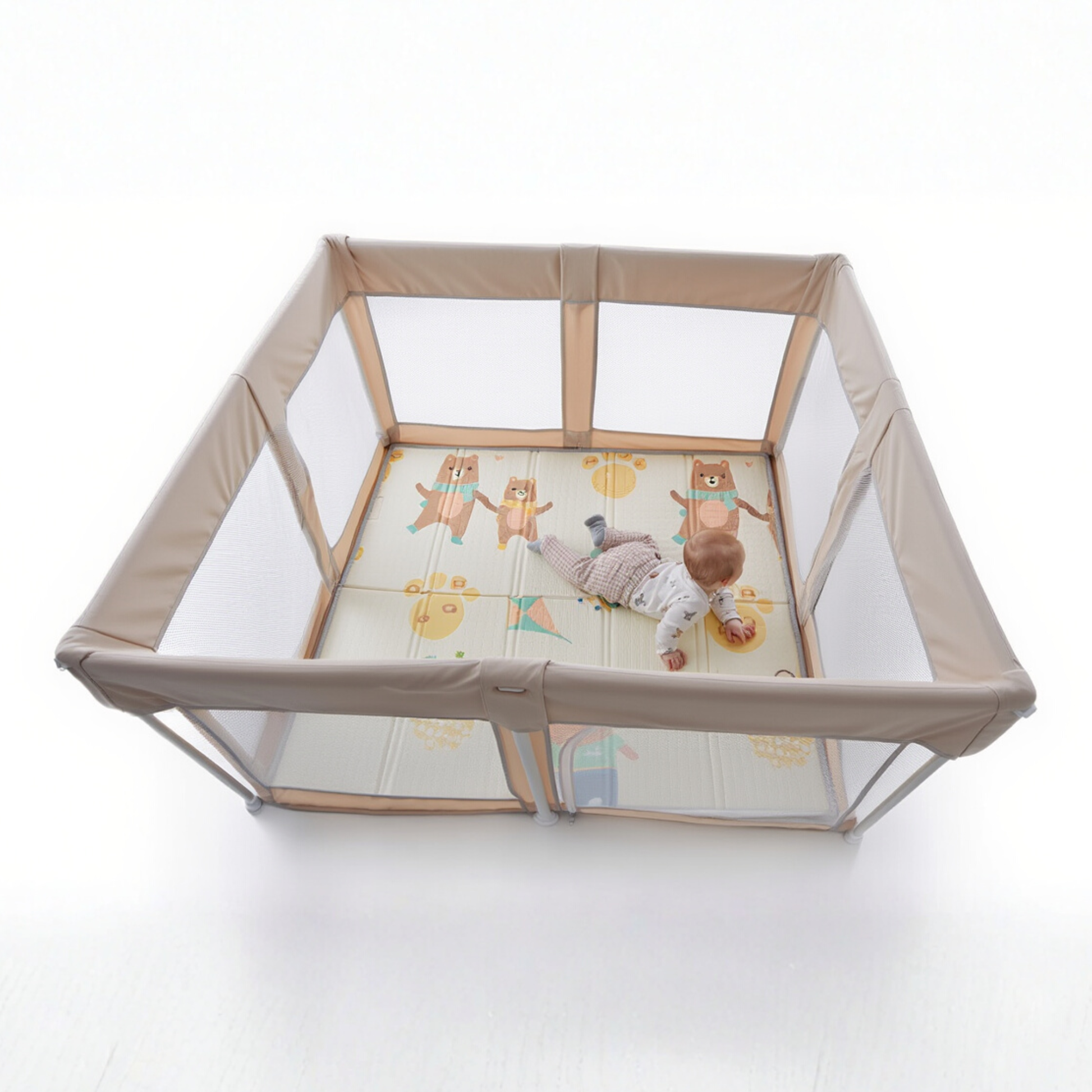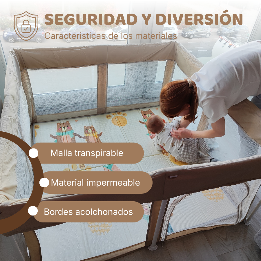Protección, comodidad y facilidad de limpieza en un solo diseño. El corral perfecto para que tu bebé juegue y explore sin riesgos.