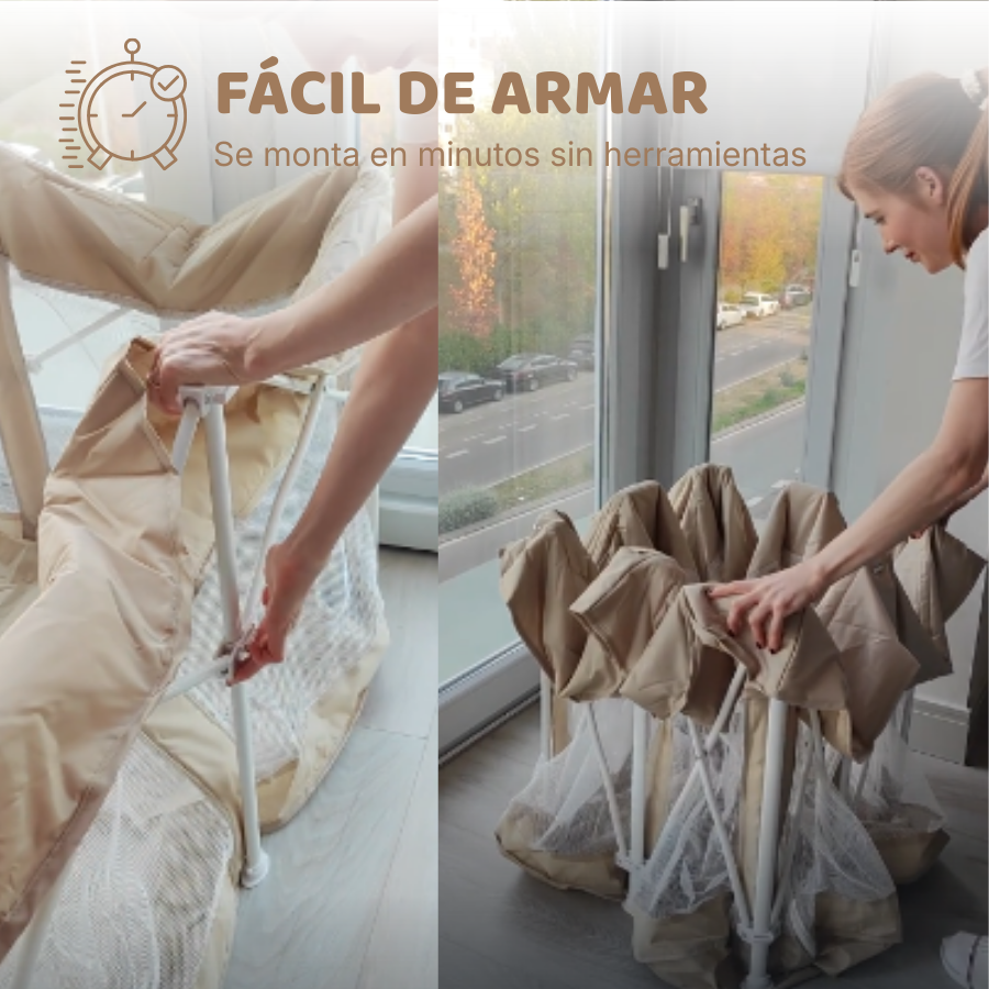 Elcorralito bebése monta en minutos sin herramientas. Su sistema plegable permite guardarlo y transportarlo fácilmente, ocupando muy poco espacio.