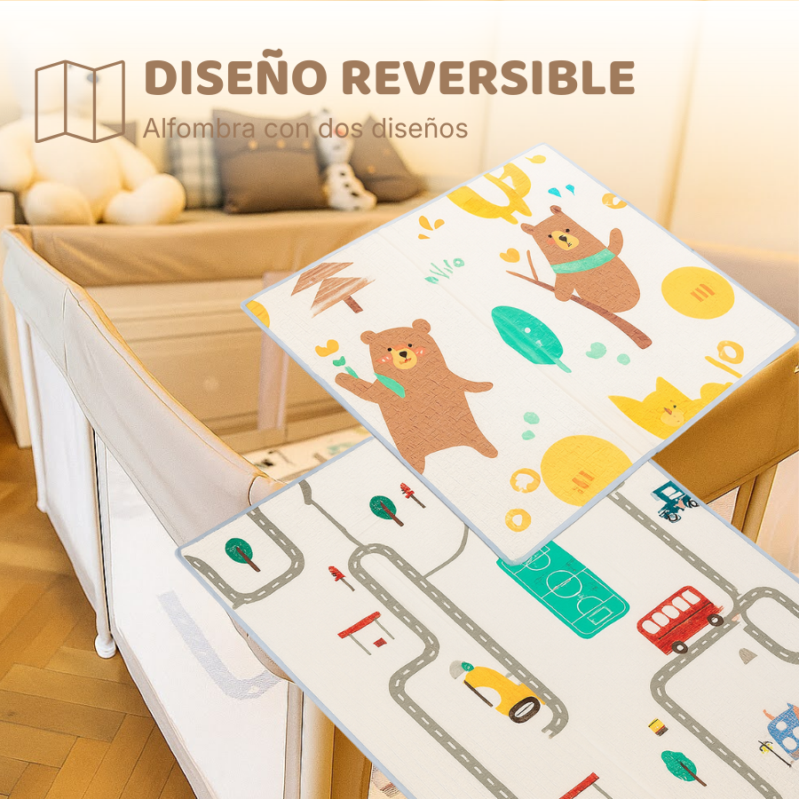 Cambia la estética del corral cuando quieras. Una alfombra reversible, suave y divertida para acompañar a tu bebé cada día.